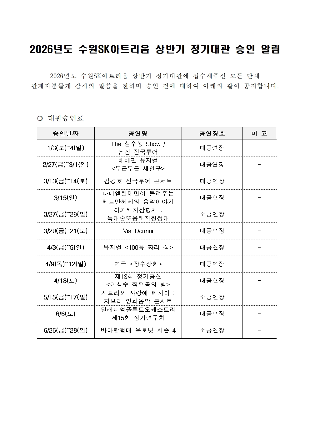 2026년도 수원SK아트리움 상반기 정기대관 승인 알림