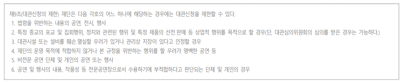 □ 신청시 유의사항 ❍ 대관 규정 시간(9~22시)내 셋업/공연/철수까지 모두 완료하여 주시기 바랍니다. ※ 22시 이후 추가 사용은 불가하며, 필요 시 익일 오전 대관을 신청하여 주시기 바랍니다. ❍ 반드시 지정된 신청서 양식을 이용하여 주시기 바랍니다. ❍ 대관신청서 및 공연(행사)계획서는 대관심의 시 중요한 자료가 되므로, 신청 공연물의 자료를 빠짐없이 제출하시기 바랍니다. ※ 작품설명서와 작품의 구성 및 내용, 출연진 프로필, 인원 수 및 활동사항 등 작품과 관련된 홍보물, 영상물 등을 빠짐없이 제출하시기 바랍니다. ※ 서류 미비 시 심의에서 제외될 수 있습니다. ❍ 대관 신청과 실제 공연이 다를 경우, 대관이 취소될 수 있습니다. ❍ 동일한 날짜에 대공연장과 소공연장 대관을 중복으로 신청할 경우, 대공연장 신청이 우선시 될 수 있습니다. ❍ 8~9월 대공연장 대관 일정의 동일 기간 내 신청이 경합될 경우, 장기공연 신청이 우선시 될 수 있습니다. ❍ 사업자등록증(또는 신분증)과 신청서의 단체명이 다를 경우, 대관 심의에서 제외될 수 있습니다. ❍ 제출 서류 누락에 대해서 재단 측에서는 어떠한 책임도 지지 않습니다. ❍ 제출된 서류 및 자료는 반환하지 않습니다.