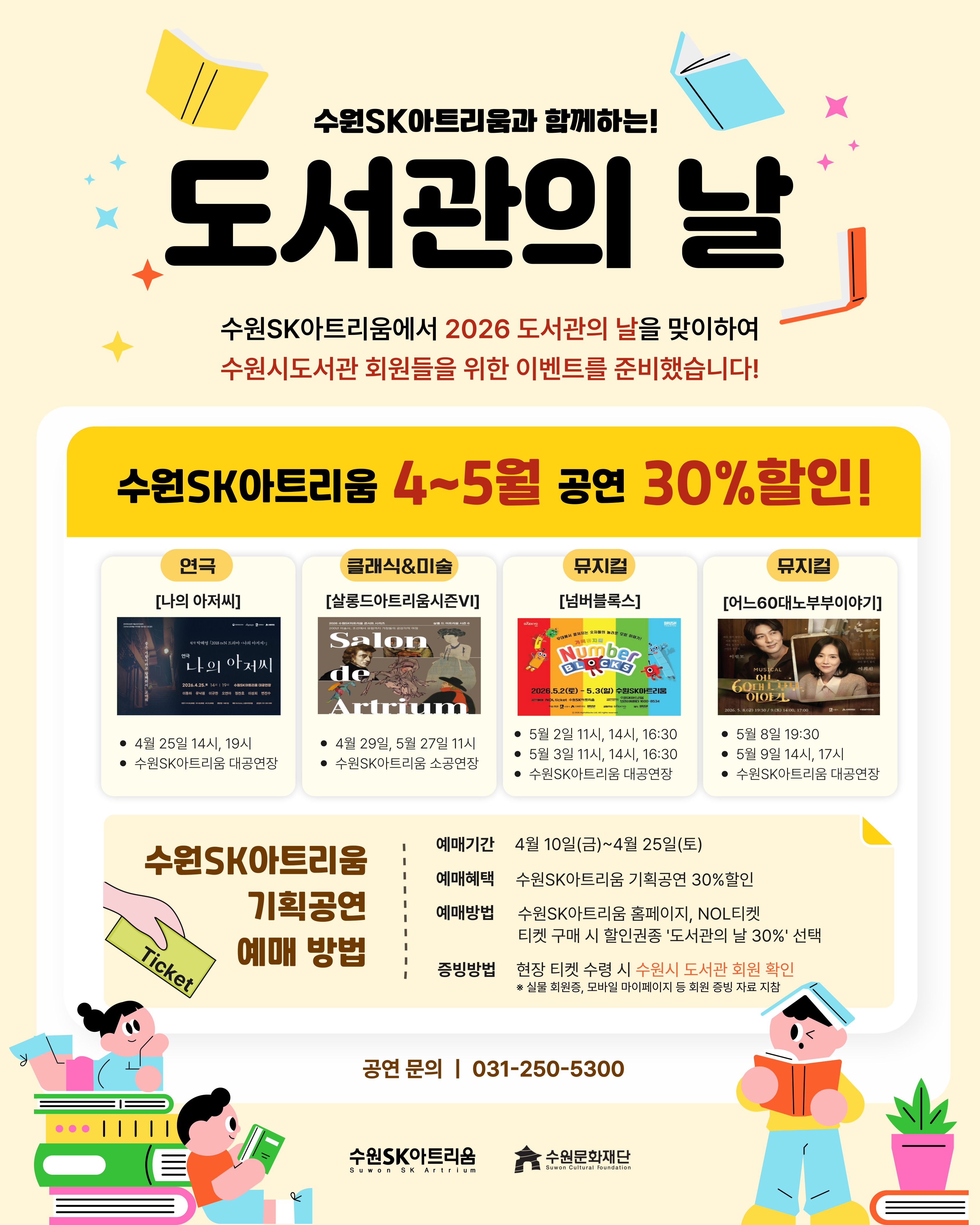 <할인 안내> 할인기간: 4/10(금) ~ 25(토) 할인공연: 아래 이미지 참조 할인경로: 수원SK아트리움 홈페이지 및 NOL티켓 > 할인권종 '도서관의 날 30%' 선택 ※ 수원SK아트리움 홈페이지 예매 링크 (로그인 필수) 5/2(토)~3(일) 뮤지컬 <넘버블록스> 예매 바로가기 5/8(금)~9(토) 뮤지컬 <어느 60대 노부부 이야기> 예매 바로가기 ※ 4/29(수), 5/27(수) 살롱드 아트리움 시즌 Ⅵ 공연은 현재 시즌권 예매 진행 중이므로, 4/14(화) 오후 2시부터 개별 공연 예매가 가능합니다.