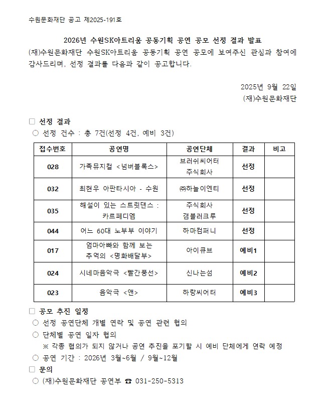 2026년 수원SK아트리움 공동기획 공연 공모 선정 결과 발표