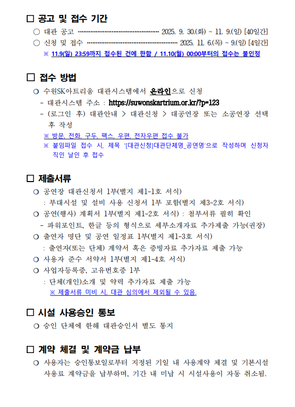 * 대관시스템 주소 : https://suwonskartrium.or.kr/?p=123